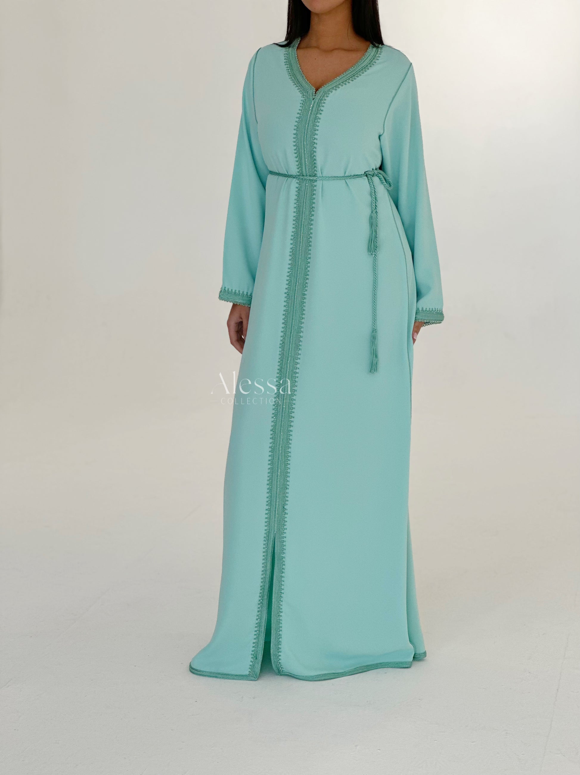 Avec sa longueur de 1m60 et sa coupe évasée aux hanches, le caftan Myra sublime chaque silhouette. Porté avec des talons, il offre une allure élancée et raffinée.