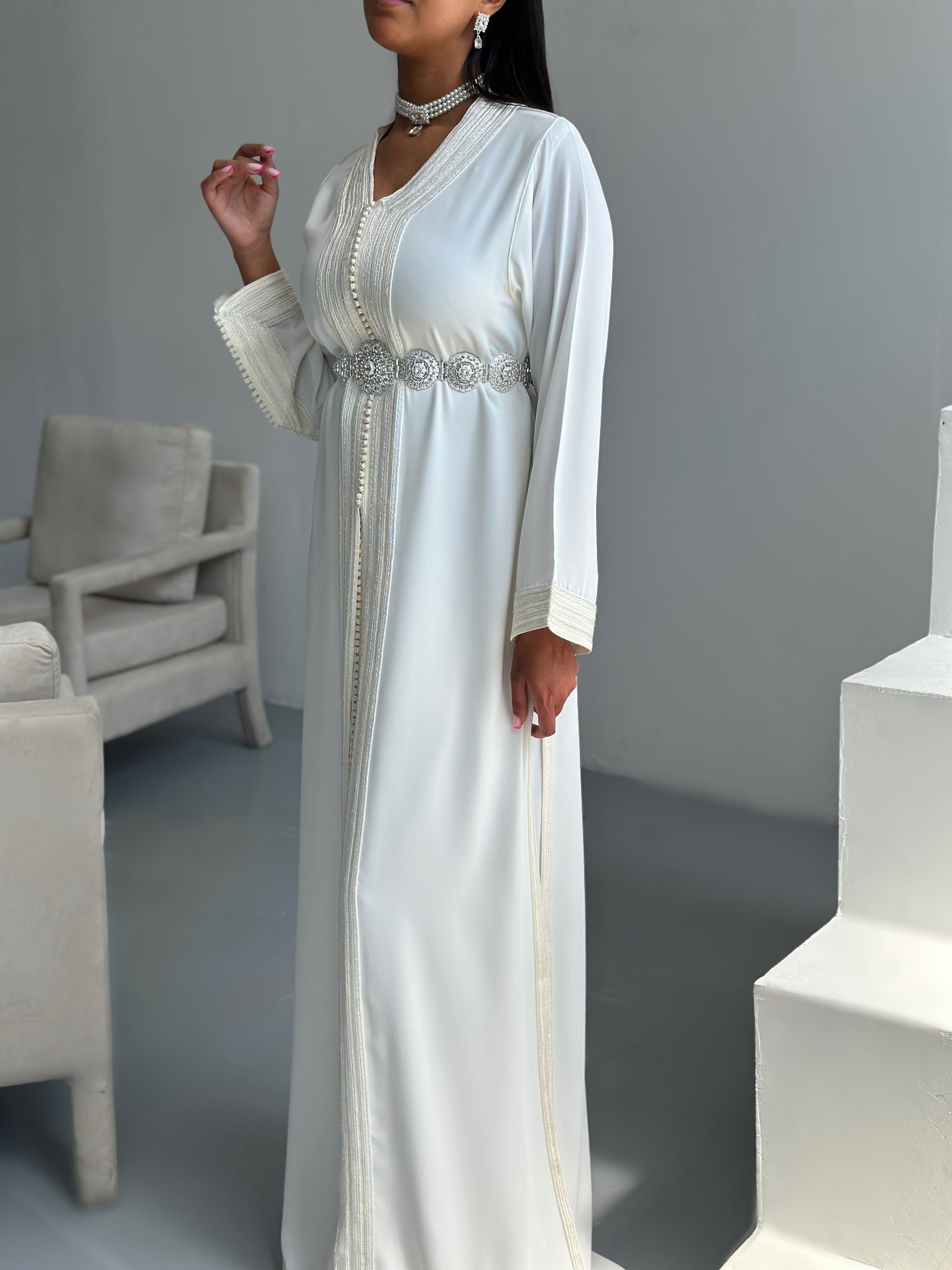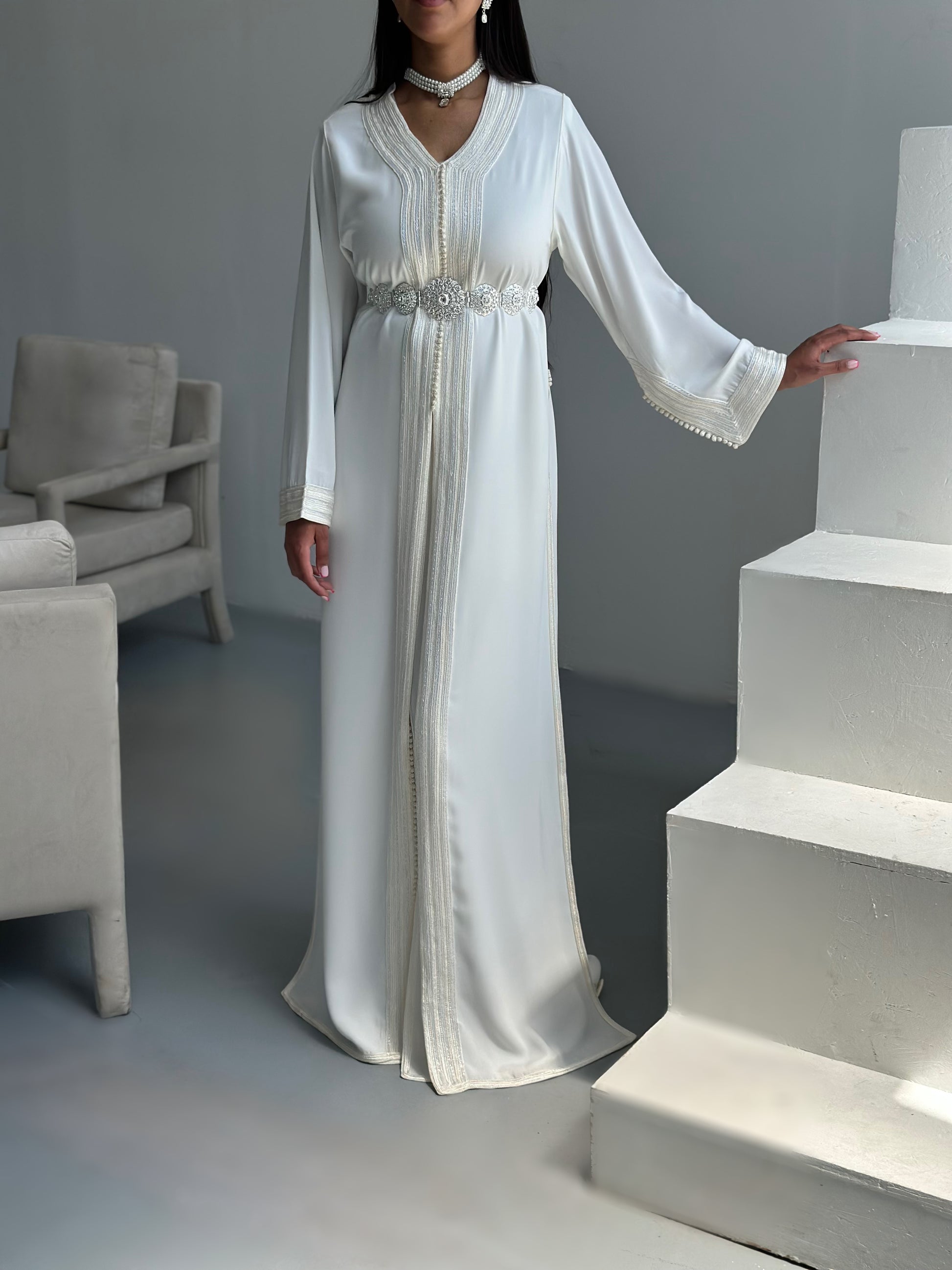 La takshita Laraa, se porte avec des talons pour donner une allure plus élancée. N'hésitez pas à ajouter des accessoires pour sublimer votre tenue.