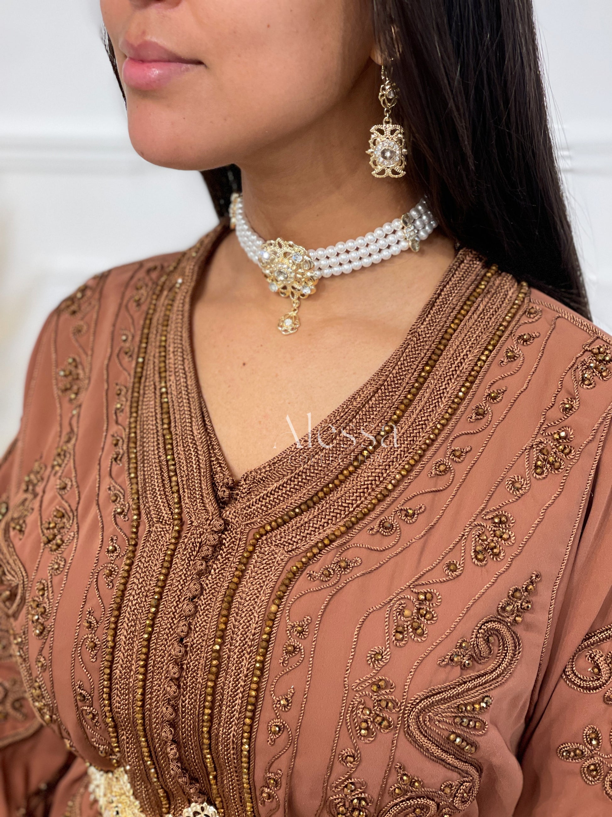 Notre parure Bella est composé d'un shoker (ras de cou) en perle ajustable a l’arrière et d'une paire de boucle d'oreilles.