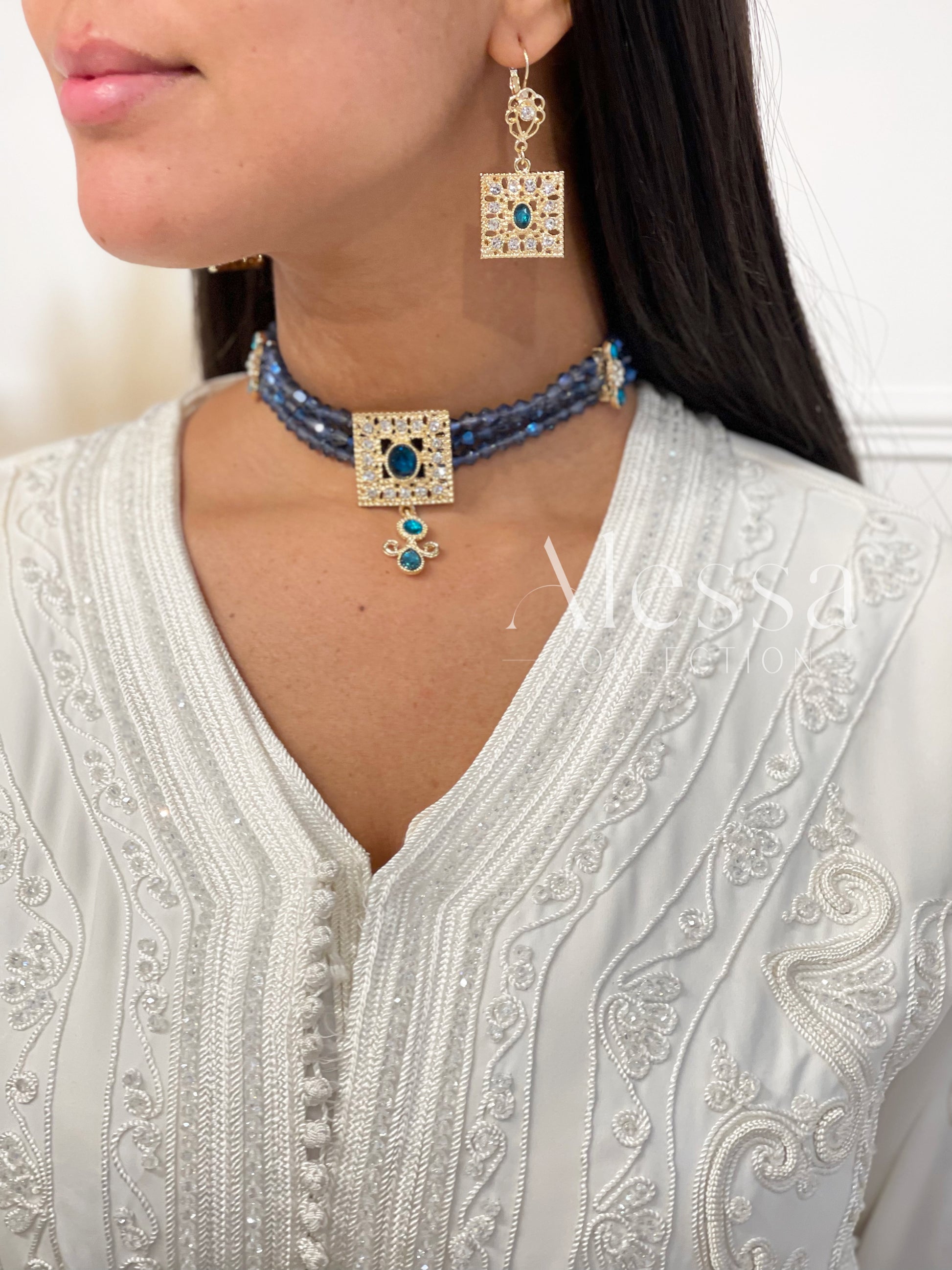 Notre parure Mina est composée d'un shoker (ras de cou) en perle ajustable à l’arrière et d'une paire de boucle d'oreilles.