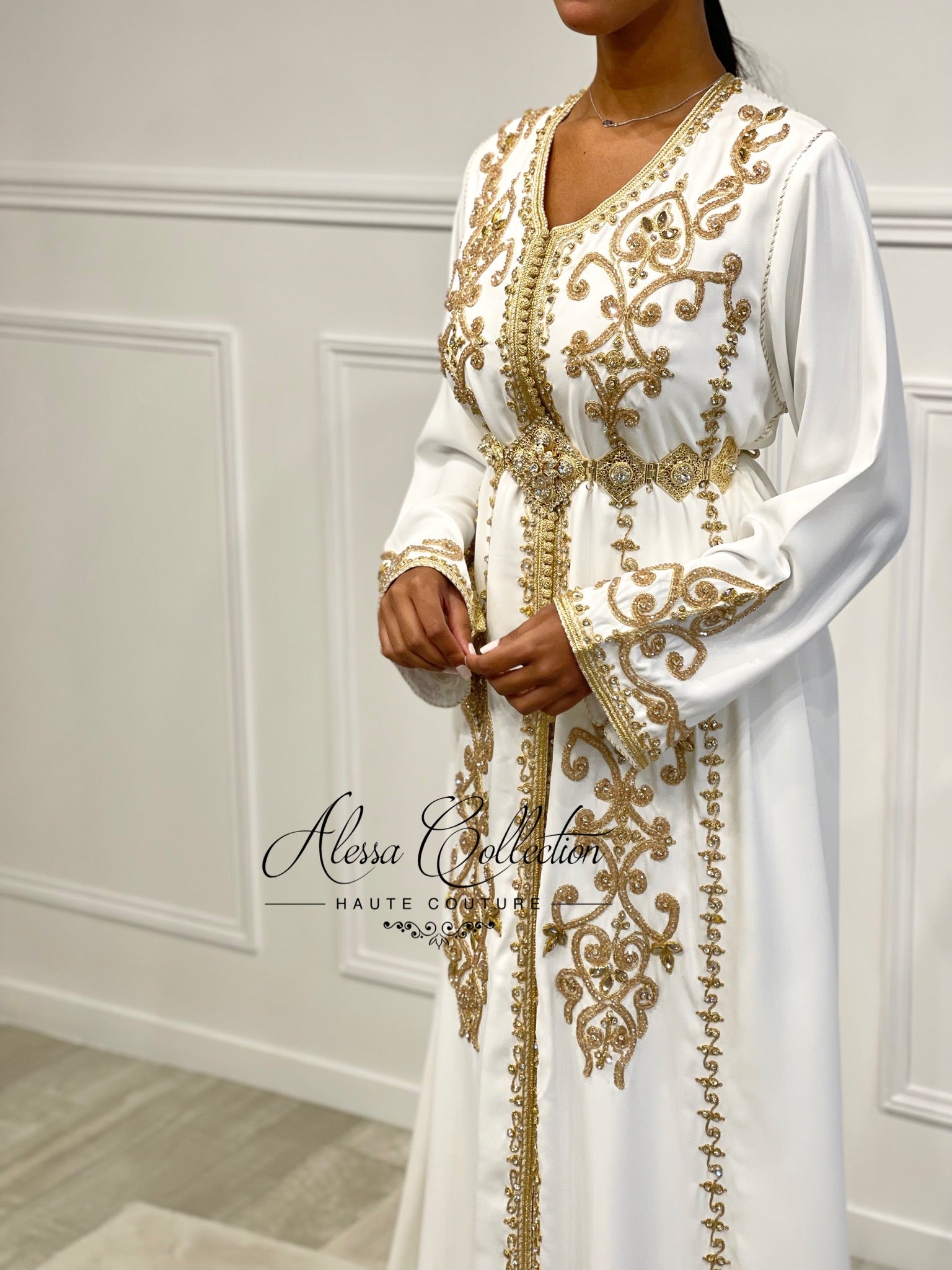 La takshita Baydaa, se porte avec des talons pour donner une allure plus élancée. N'hésitez pas à ajouter une ceinture pour sublimer votre tenue.