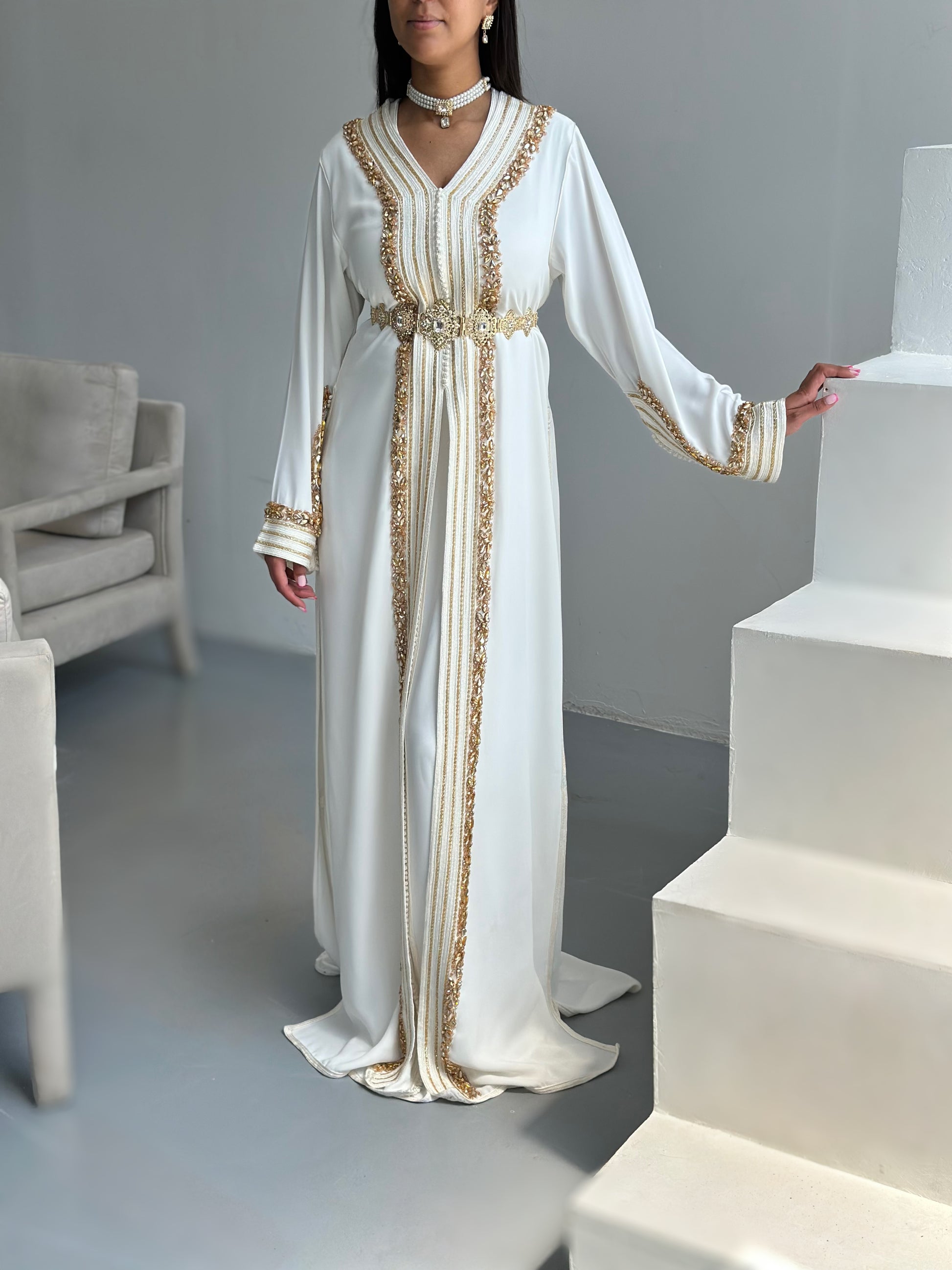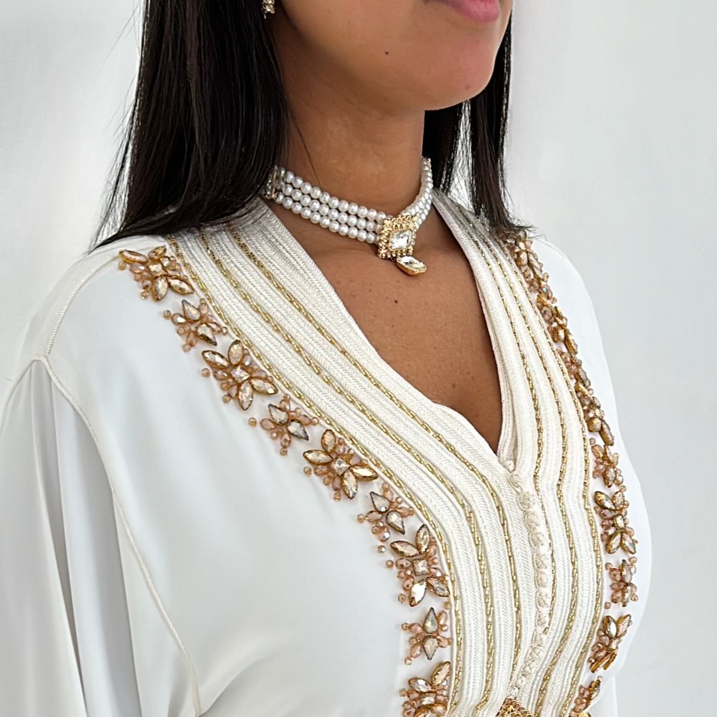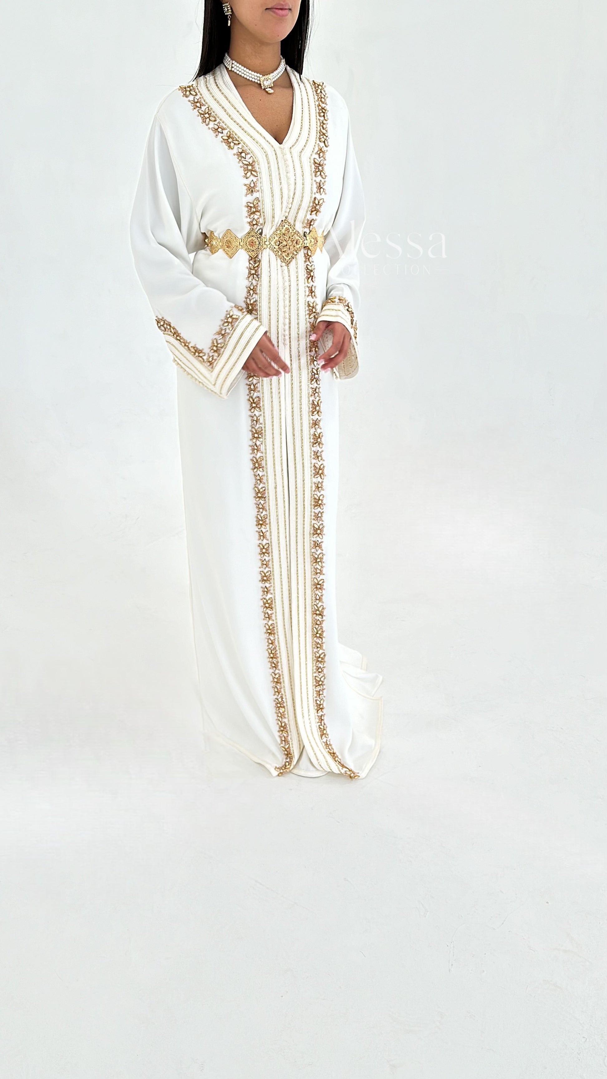 La takshita Lyna, se porte avec des talons pour donner une allure plus élancée. N'hésitez pas à ajouter des accessoires pour sublimer votre tenue.